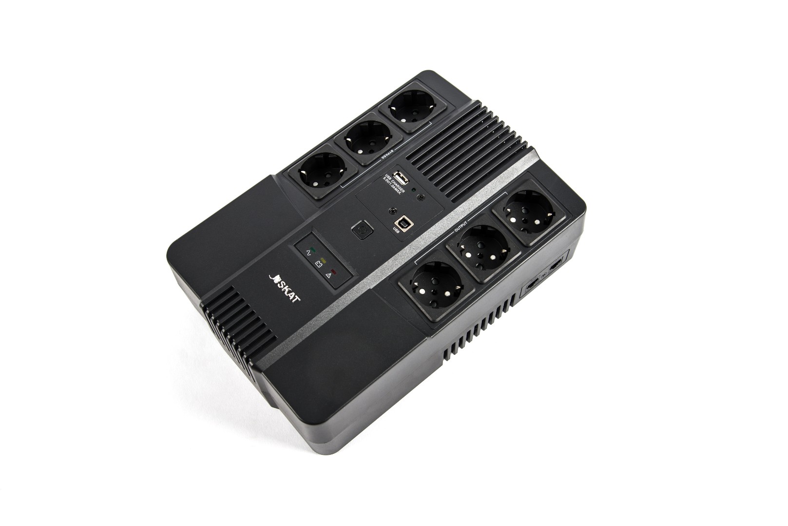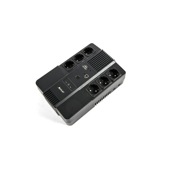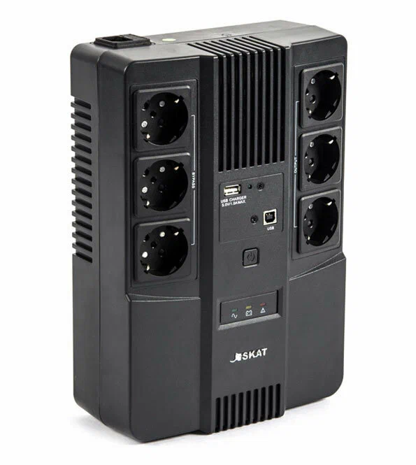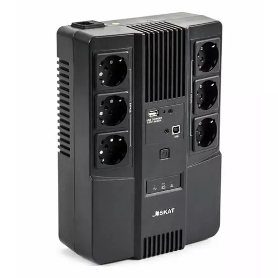 SKAT-UPS 600 AI — универсальный источник бесперебойного питания, предназначенный как для профессионального, так и для бытового назначения. Источник оснащён 6 розетками (с поддержкой и без поддержки резервной работы), выходом USB для зарядки мобильных устройств и портами RJ-45 для защиты локальной сети — всё, что нужно для безопасной работы компьютерной техники. Удобное крепление на стену позволяет разместить SKAT-UPS 600 AI, не занимая лишнего пространства на рабочем месте.