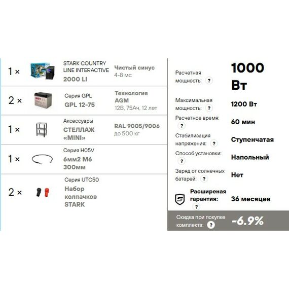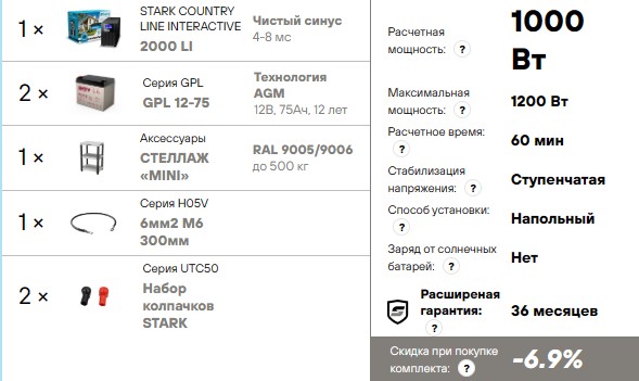 Комплект ИБП Stark Country 2000 LI нагрузка 1000Вт, автономия 1 час, стеллаж