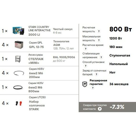 Комплект системы бесперебойного питания Stark Country 2000 LI нагрузка 800Вт, автономия 3 часа, стеллаж