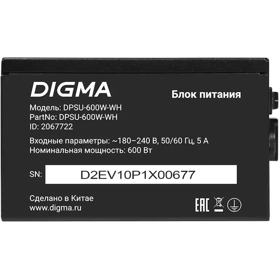 Блок питания Digma DPSU-600W-WH ATX 600W 80+ white (20+4pin) APFC 120mm fan 6xSATA RTL