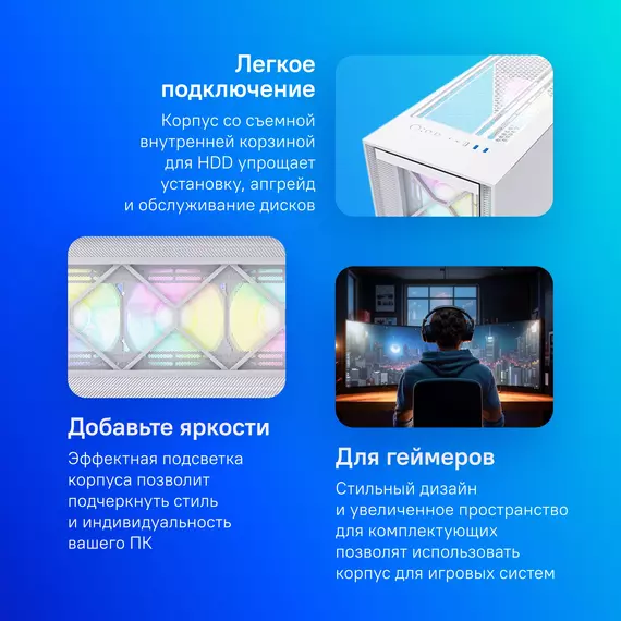 | Особенности | поставляется с двумя передними панелями: сетчатой ??панелью для дополнительного воздушного потока и панелью из закаленного стекла |