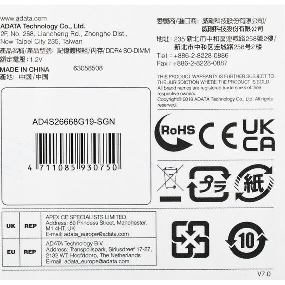 Память AData 8GB DDR4 2666MHz PC4-21300 CL19 SO-DIMM 260-pin 1.2В dual rank RTL [AD4S26668G19-SGN]