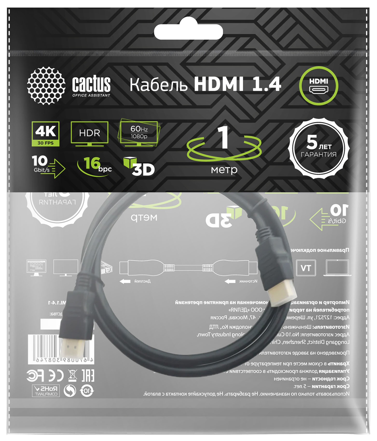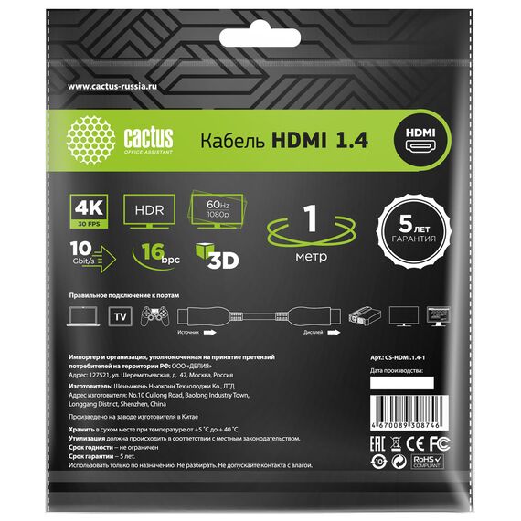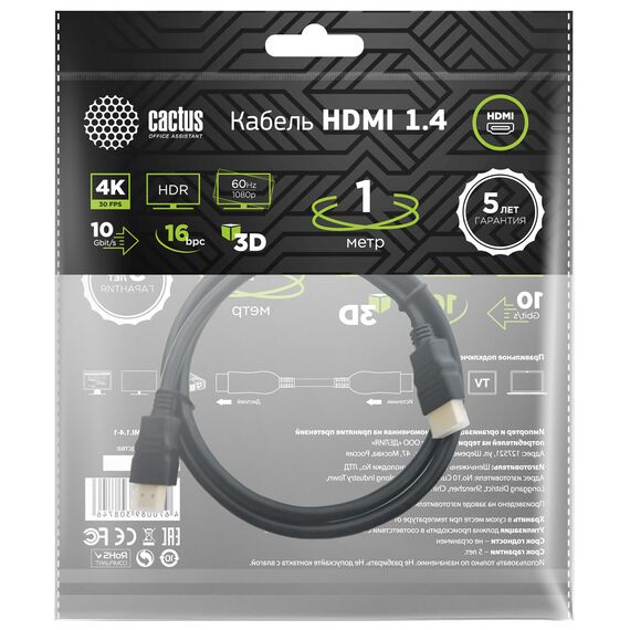 Описание Cactus HDMI (m)/HDMI (m) 1м. [CS-HDMI.1.4-1]
