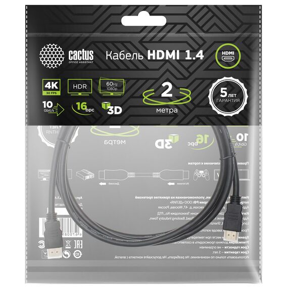 Описание Cactus HDMI (m)/HDMI (m) 2м. [CS-HDMI.1.4-2]