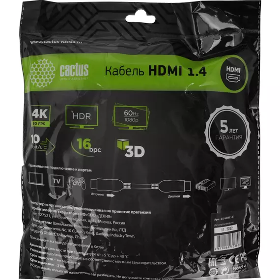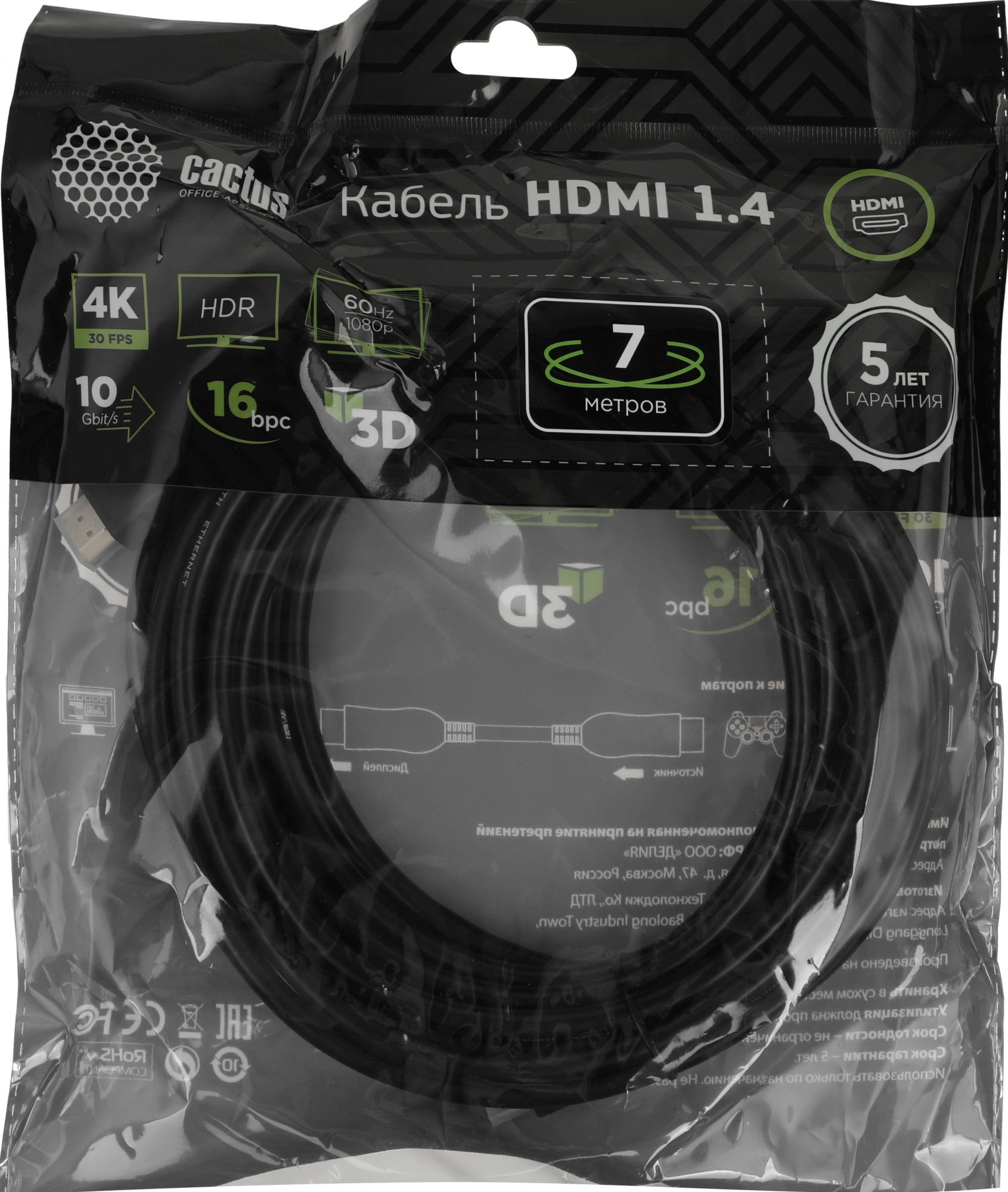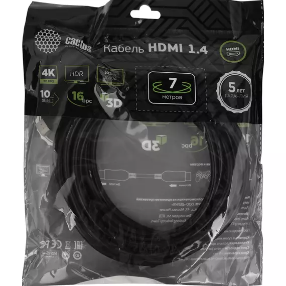Описание Cactus HDMI (m)/HDMI (m) 7м. [CS-HDMI.1.4-7]