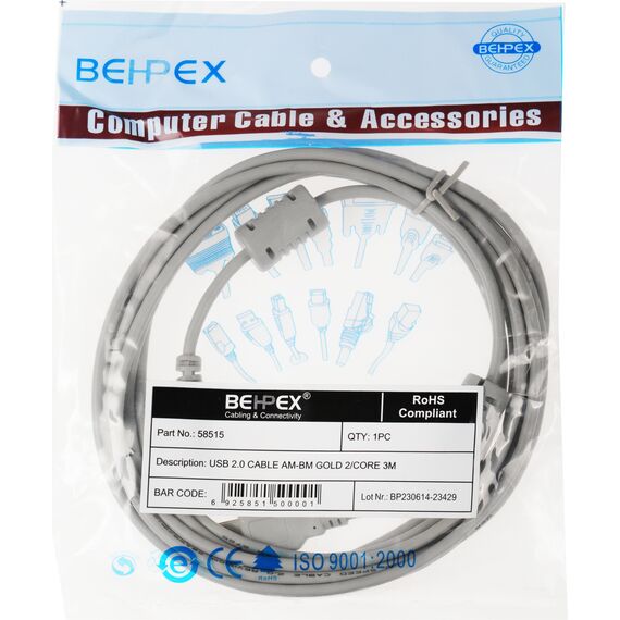 Кабель USB A(m) USB B(m) 3м феррит.кольца серый