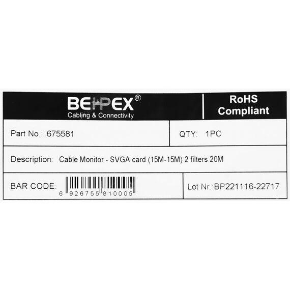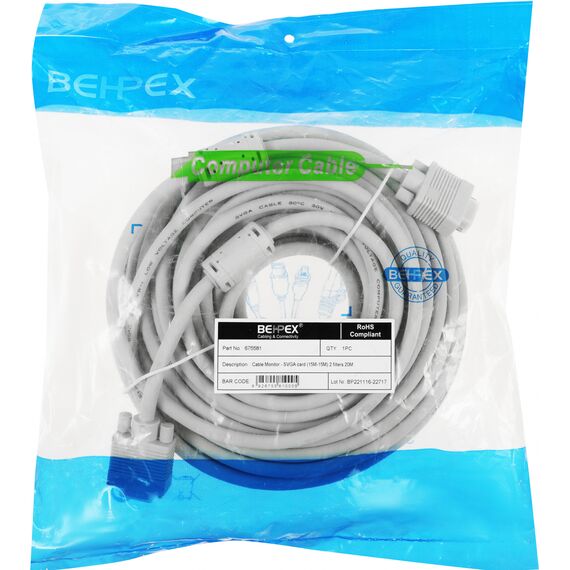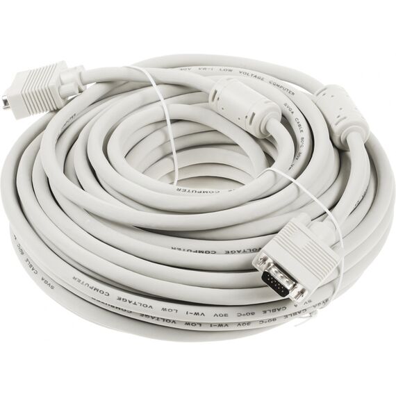 VGA кабель длиной 20 метров, дающий огромные возможности по размещению оборудования в больших помещениях. Встроенные ферритовые кольца блокируют помехи искажающие идущий по проводу сигнал, таким образом повышая его качество.