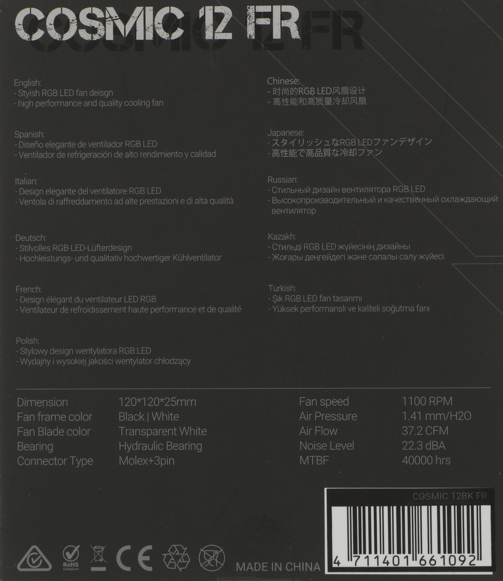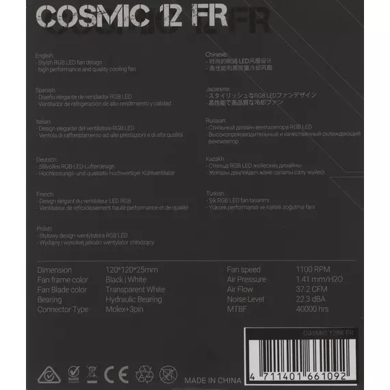 Вентилятор для корпуса Formula Cosmic 12BK RGB 120х120x25 черный 3-pin 4-pin (Molex) 22.3дБ [COSMIC 12BK FR]