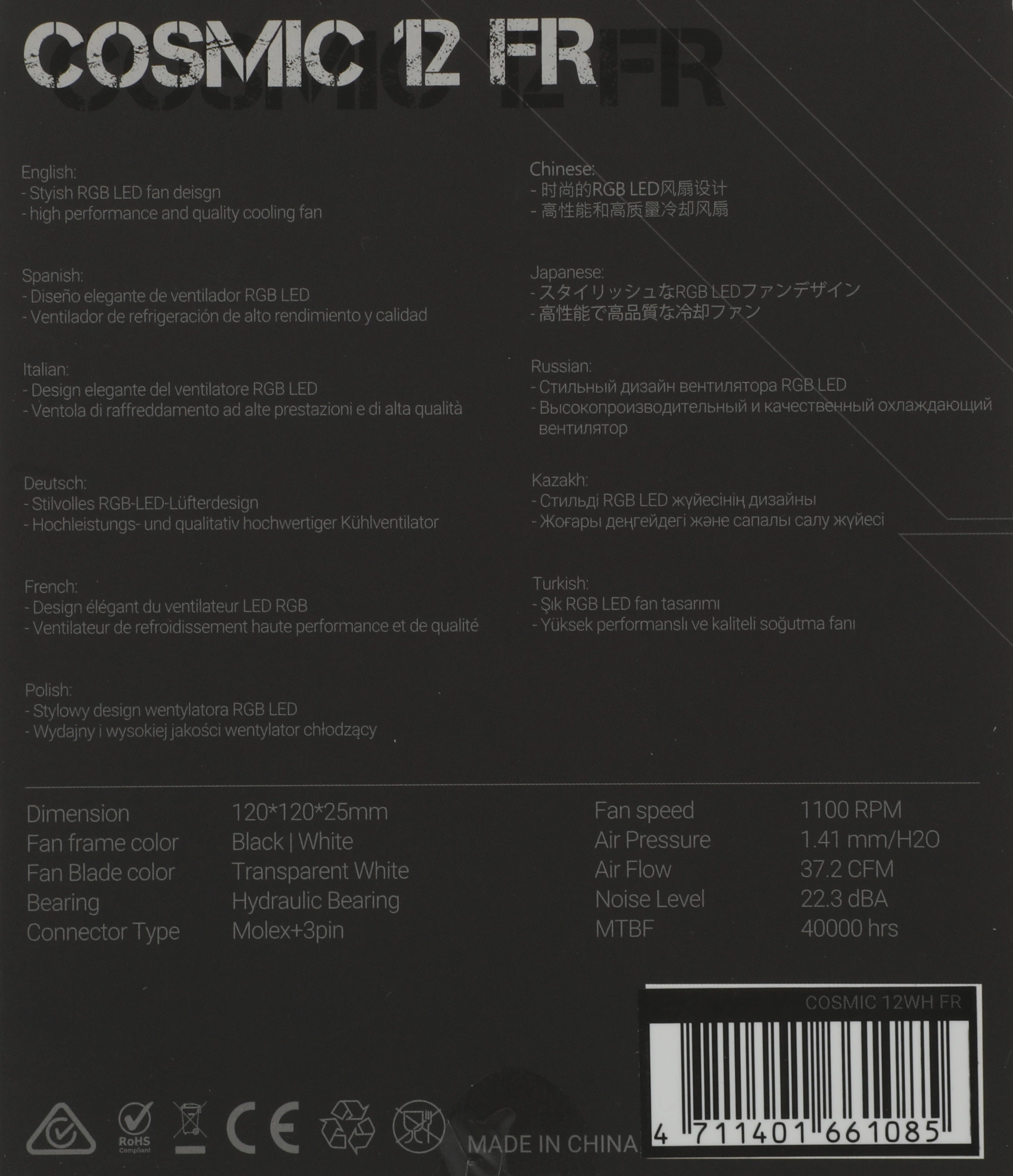 Вентилятор для корпуса Formula Cosmic 12WH RGB 120х120x25 белый 3-pin 4-pin (Molex) 22.3дБ RTL [COSMIC 12WH FR]