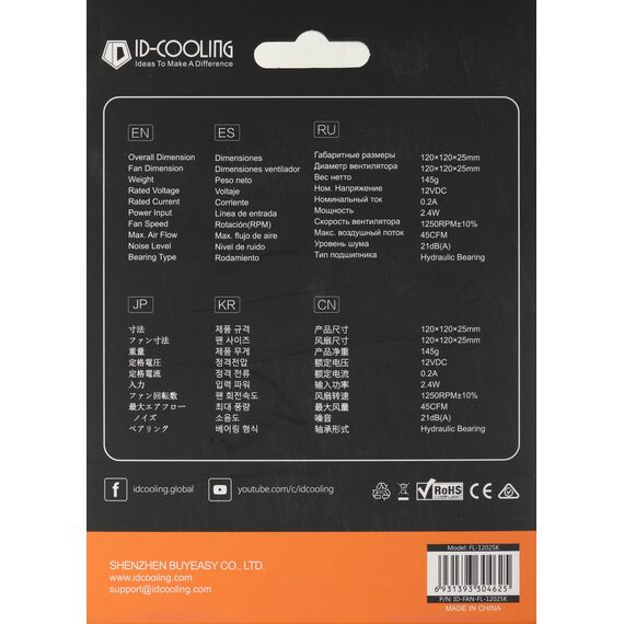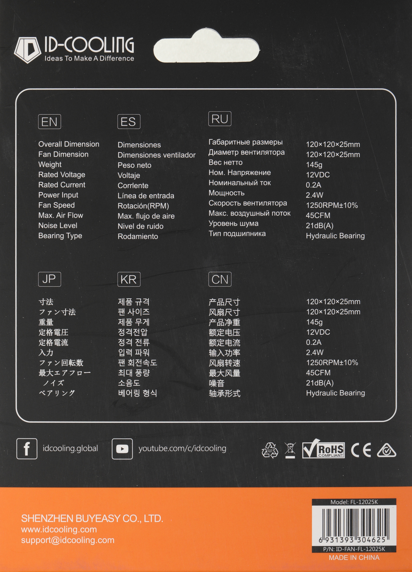 Вентилятор для корпуса ID-Cooling FL-12025K 120х120x25 черный 3-pin 21дБ RTL