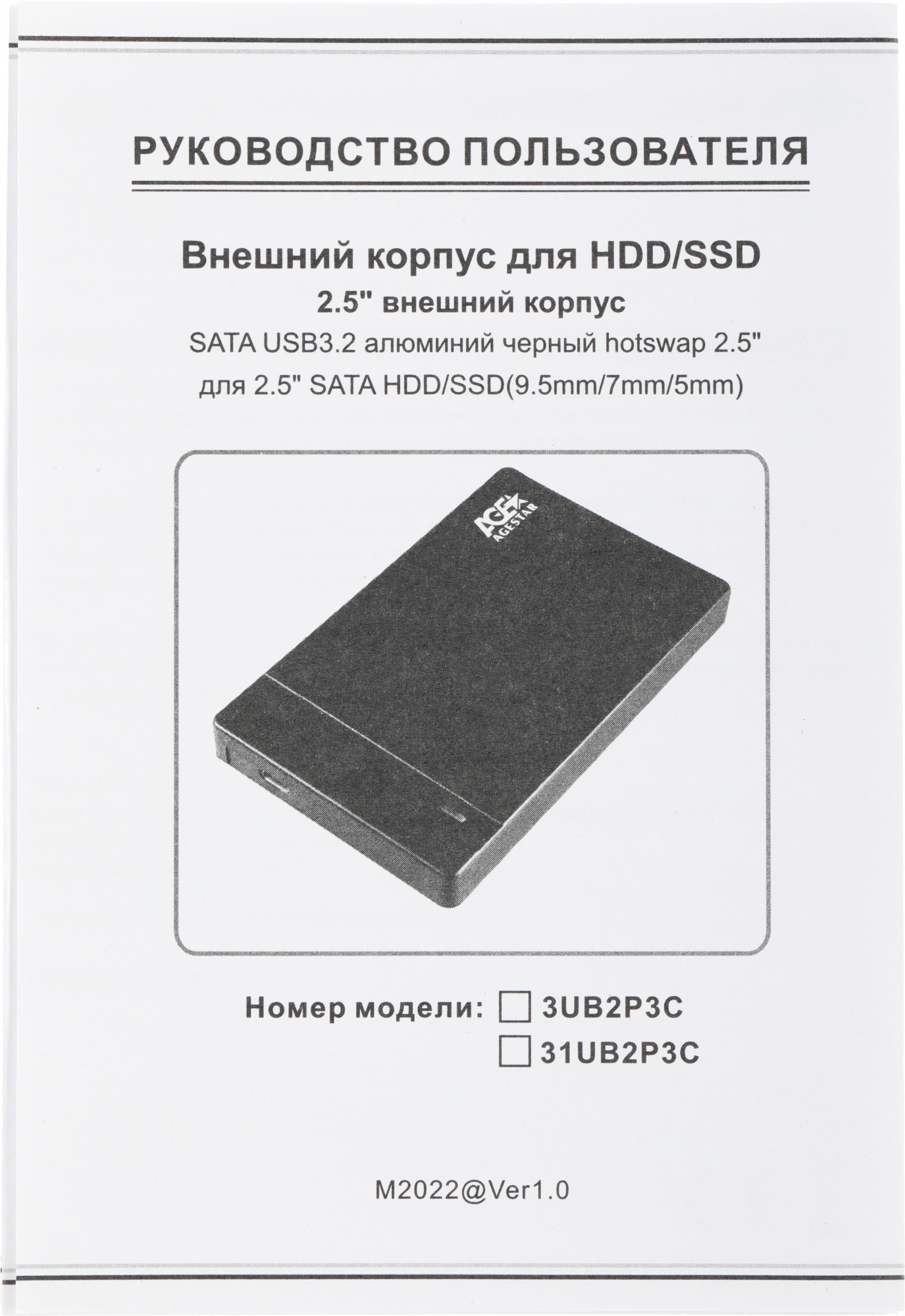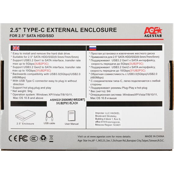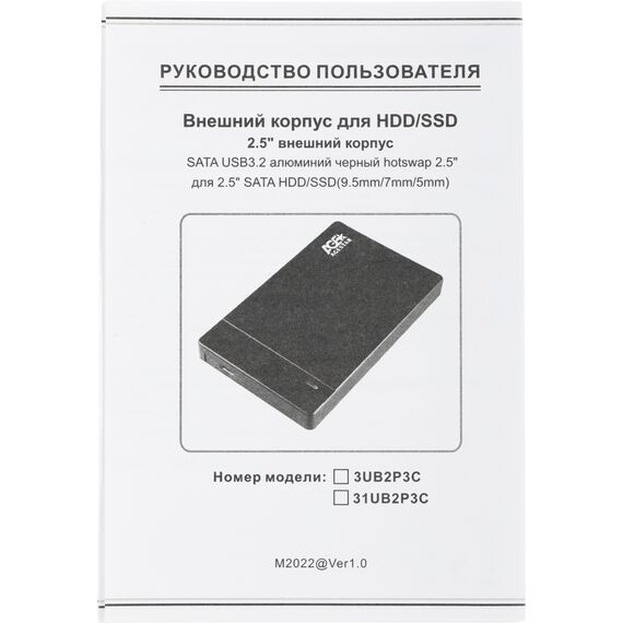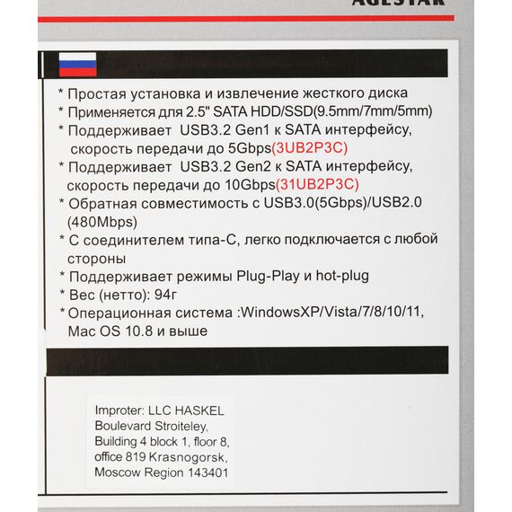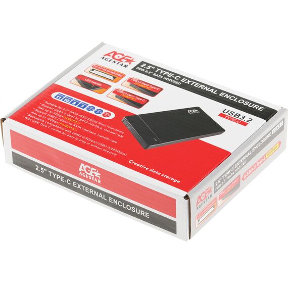 Внешний корпус для HDD/SSD AgeStar 31UB2P3C SATA USB3.2 пластик черный hotswap 2.5"