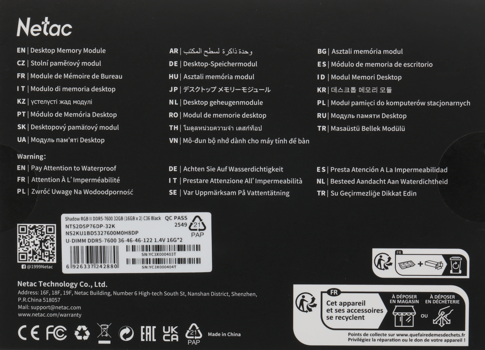 Память Netac 2x16GB Shadow II RGB DDR5 7600MHz Gaming PC5-60800 CL36 DIMM ECC 288-pin 1.4В с радиатором RTL [NTS2D5P76DP-32K]