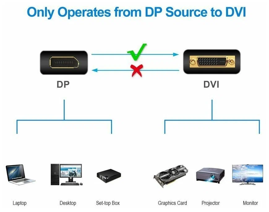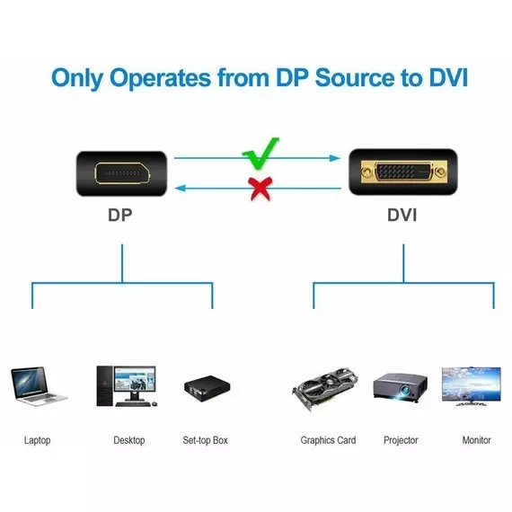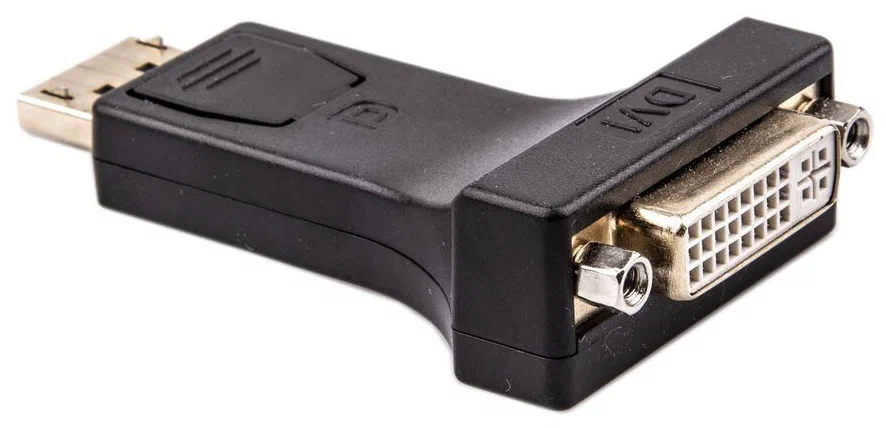 Однонаправленный переходник для подключения монитора или телевизора с интерфейсом DVI к ноутбуку или видеокарте с выходом DisplayPort. Максимальное разрешение 1920 x 1080@60 Hz