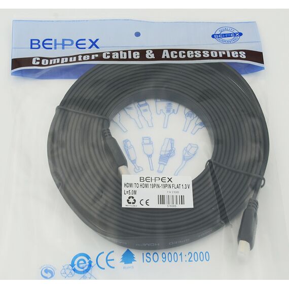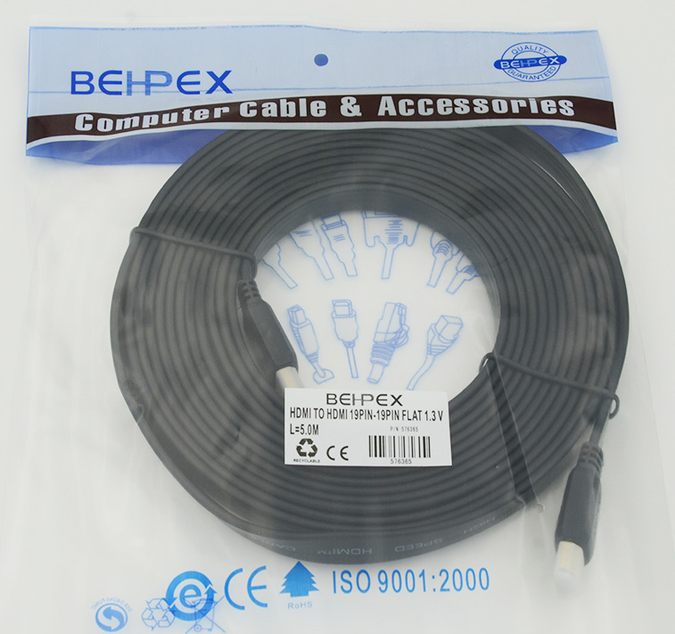 HDMI кабель для подключений компьютеров, ноутбуков Blu-Ray плееров и прочего оборудования к мониторам, телевизорам и проектора. Плоское сечение позволяет прокладывать кабель через узкие щели и трудно доступные места. Длина кабеля 5 метра, позволит разместить оборудование в оптимальном месте.