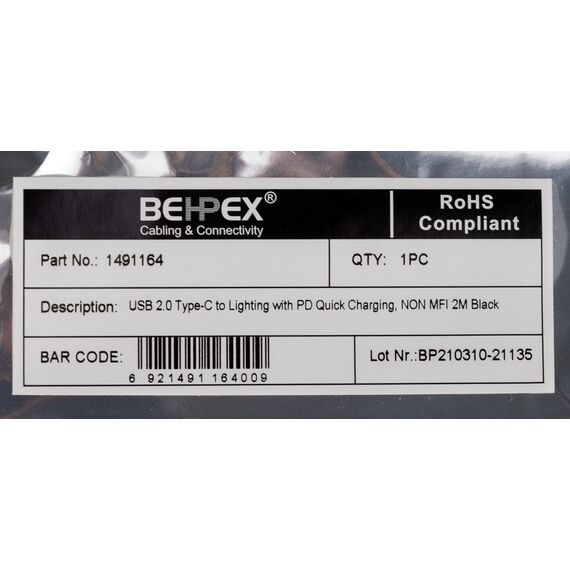 Кабель PD quick charge USB Type-C (m)-Lightning (m) 2м черный