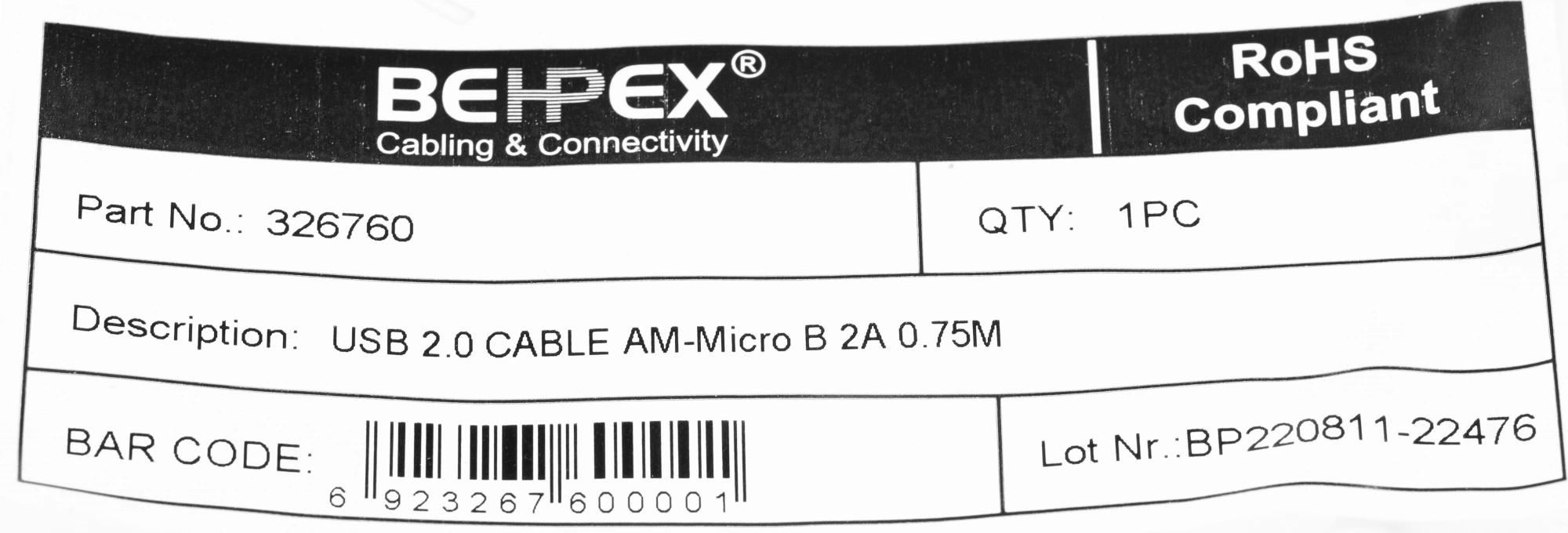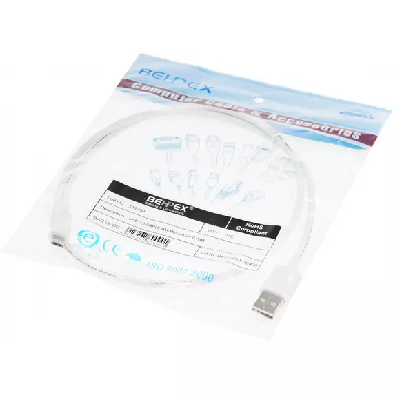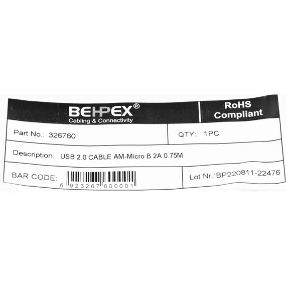 Кабель USB для передачи данных между персональными компьютерами и смартфонами, планшетами, MP3-плеерами, а также прочими устройствами с портом micro USB. Длина кабеля 0,75 метра.