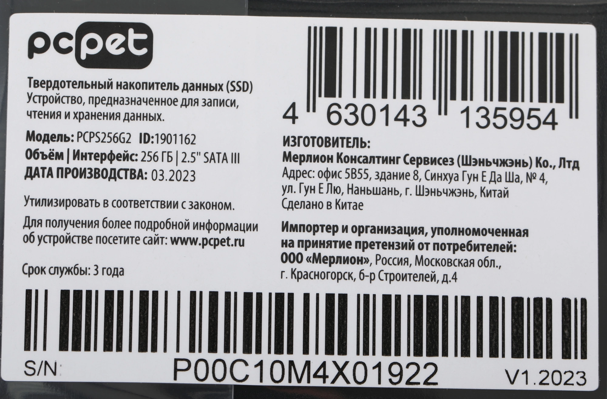Накопитель SSD PC Pet 256GB SATA-III 2.5" OEM [PCPS256G2]