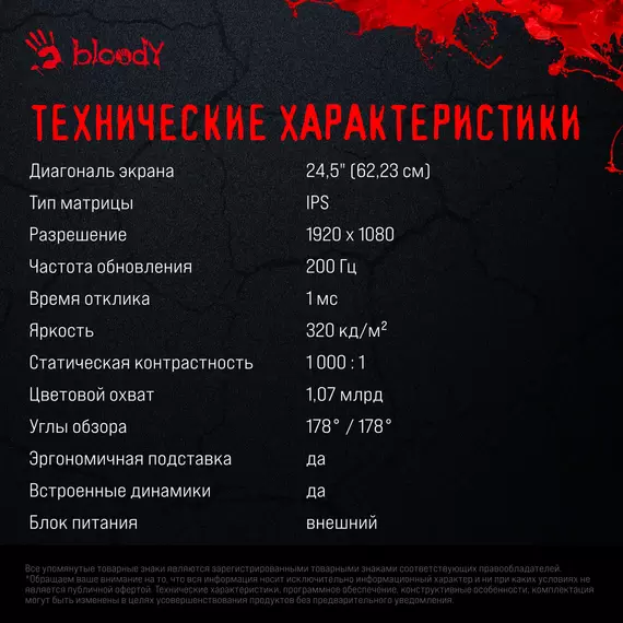 Монитор Bloody MN251F 24.5" IPS LED 1ms 16:9 HDMI M/M матовая HAS Piv 320cd 178гр/178гр 1920x1080 200Hz G-Sync DP FHD USB 4.3кг серый