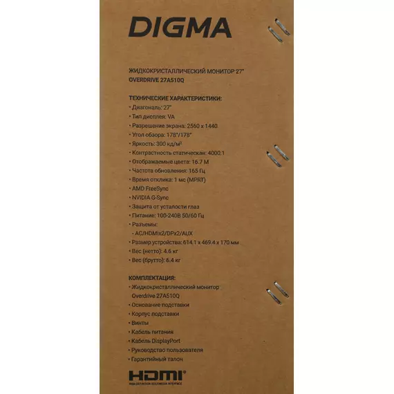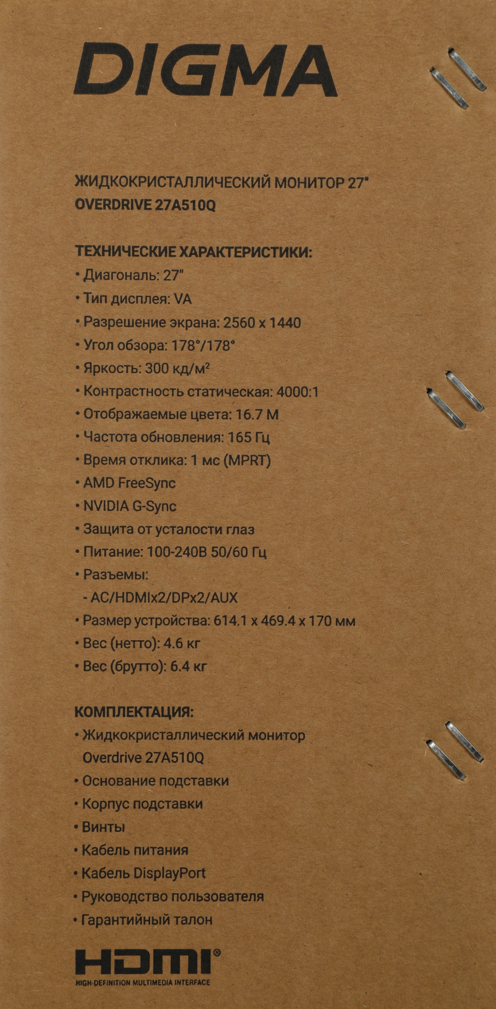 ЖК-монитор Digma Overdrive 27A510Q 27" черный VA LED 1ms 16:9 HDMI M/M матовая 300cd 178гр/178гр 2560x1440 165Hz G-Sync FreeSync DP 2K 5.8кг [DM27VG02]