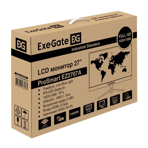 Монитор безрамочный Exegate ProSmart EZ2707A 27" IPS LED, FHD, 1920x1080@75Гц, 16:9, 280cd/m2, 1000:1, 178°/178°, 5ms, Speakers, D-Sub, HDMI1.4 [EX296348RUS]