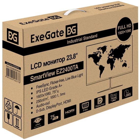 Монитор безрамочный Exegate SmartView EZ2400TA 23.8"IPS LED, FHD, 1920x1080@75Гц, 16:9, 250cd/m2, 1000:1, 178°/178°, 5ms, D-Sub, HDMI1.4, DisplayPort, Audio-out [EX296282RUS]