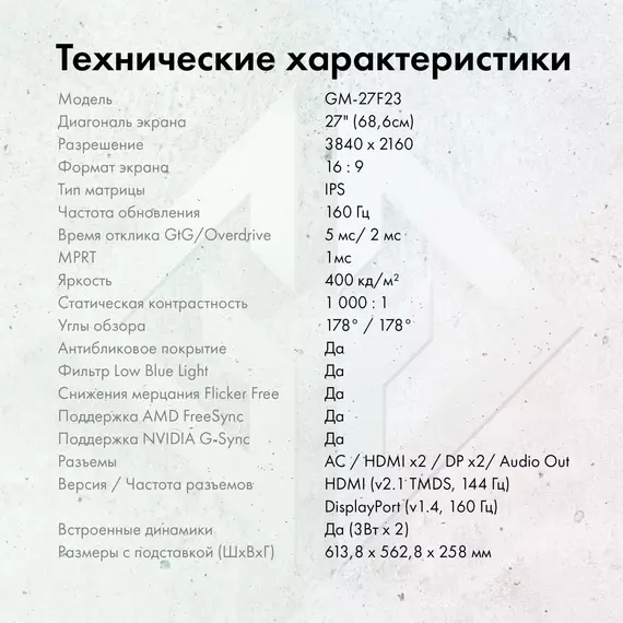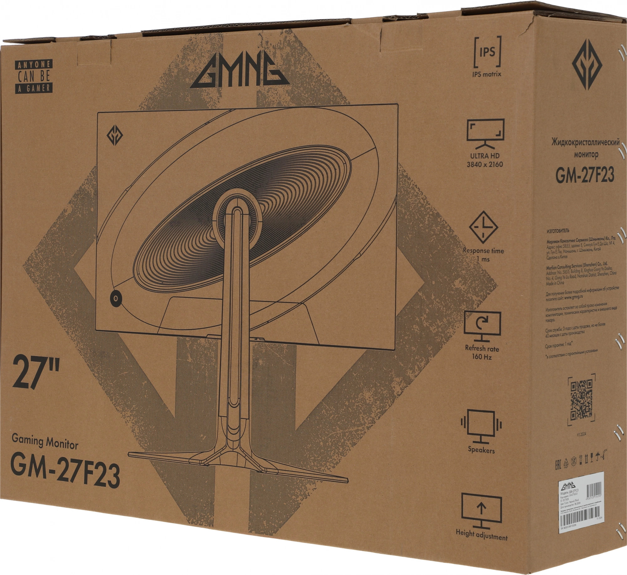 Монитор GMNG Gaming GM-27F23 27" IPS LED 2ms 16:9 HDMI M/M матовая HAS Piv 400cd 178гр/178гр 3840x2160 160Hz G-Sync FreeSync DP Quad 4K (2160p) 6.63кг черный [GM27SG03]
