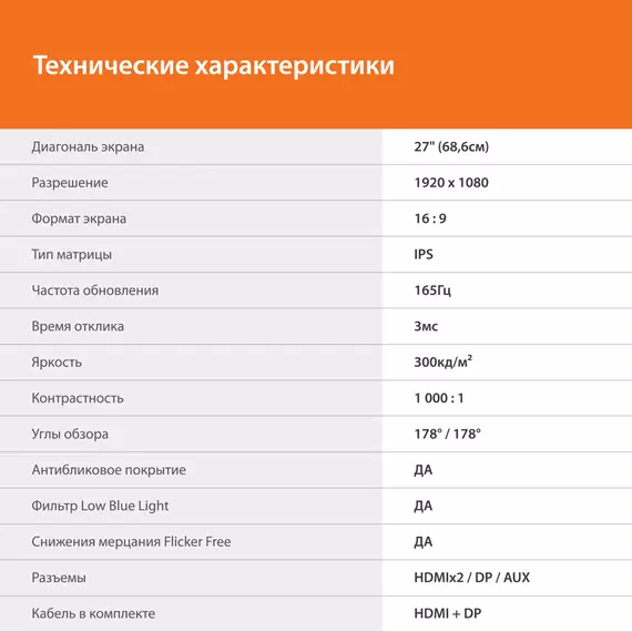 | Комплектация | кабель Display Port, кабель HDMI |