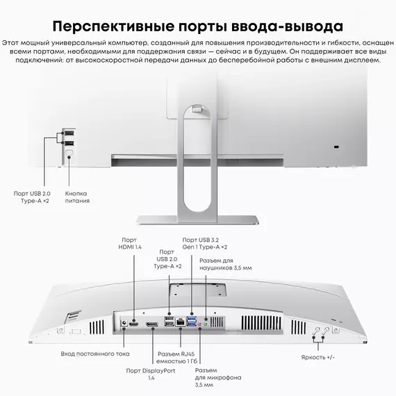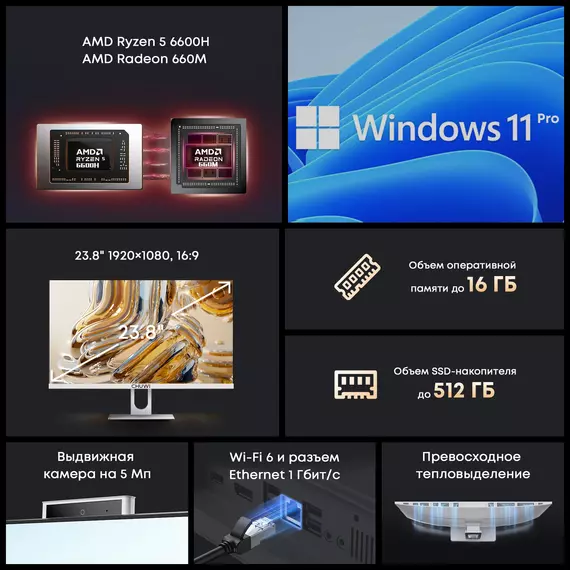 Моноблок Unitech 24 оснащен 23.8" Full HD экраном и модернизированным процессором Ryzen 5 6600H с тактовой частотой до 3.3 ГГц. Он включает в себя 16 Гб оперативной памяти и SSD на 512 Гб, что обеспечивает высокую скорость работы. Установленная операционная система Windows 11 Pro гарантирует совместимость с современными приложениями, а возможности подключения через GbitEthernet, Wi-Fi и Bluetooth создают условия для беспроводной работы. В комплекте с устройством идут клавиатура, мышь и камера, что позволяет начать работу сразу после покупки.