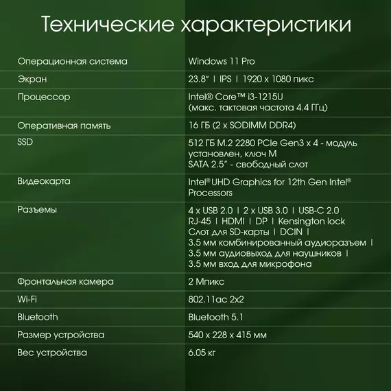 | Общий объем хранилища | SSD 512Gb |