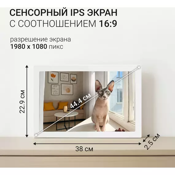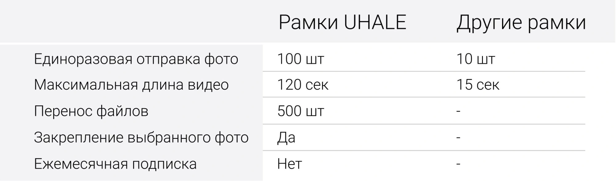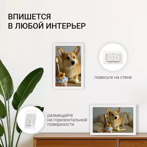 | Особенности | WiFi фоторамка, работа через приложение на iOS и Android. Удаленное управление и обмен и фотографиями и видео. |