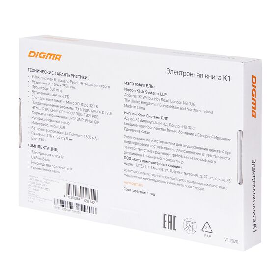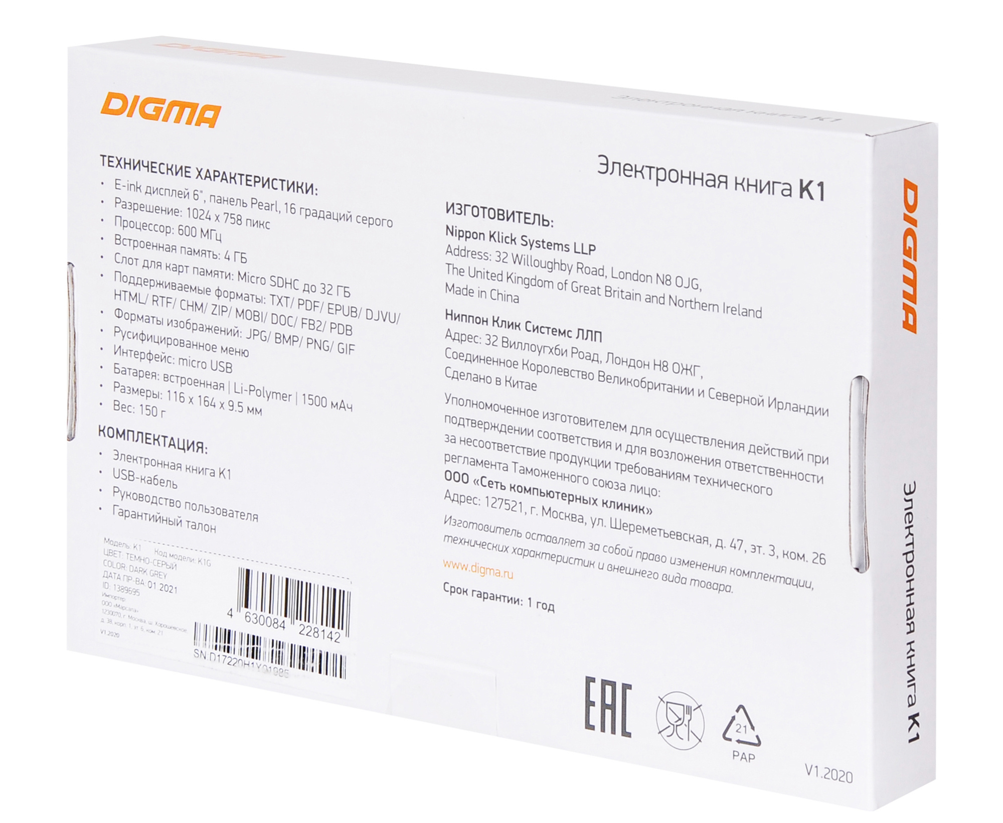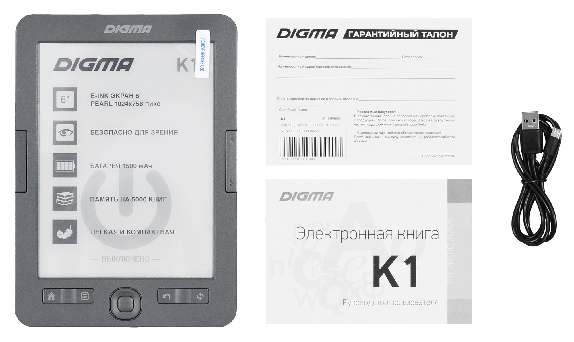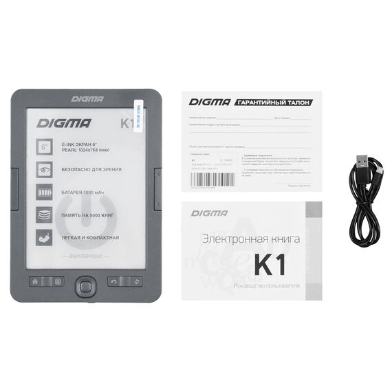 | Комплект поставки | Электронная книга K1USB-кабельРуководство пользователяГарантийный талон |