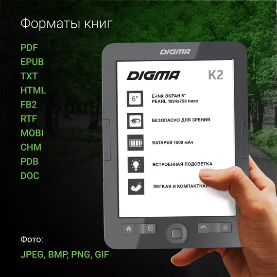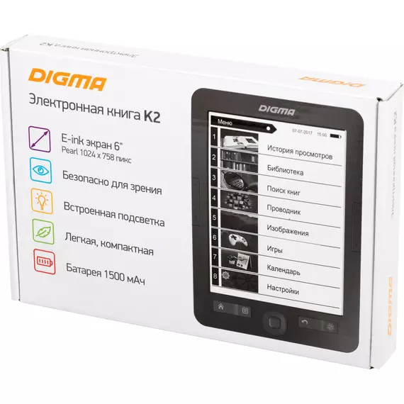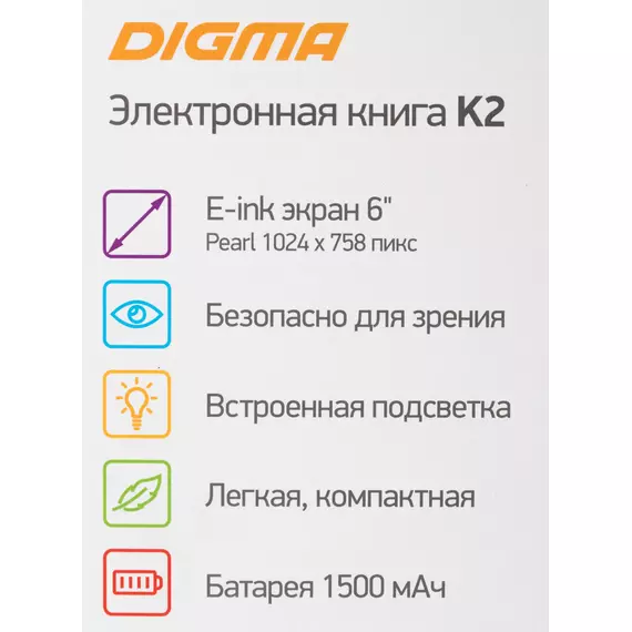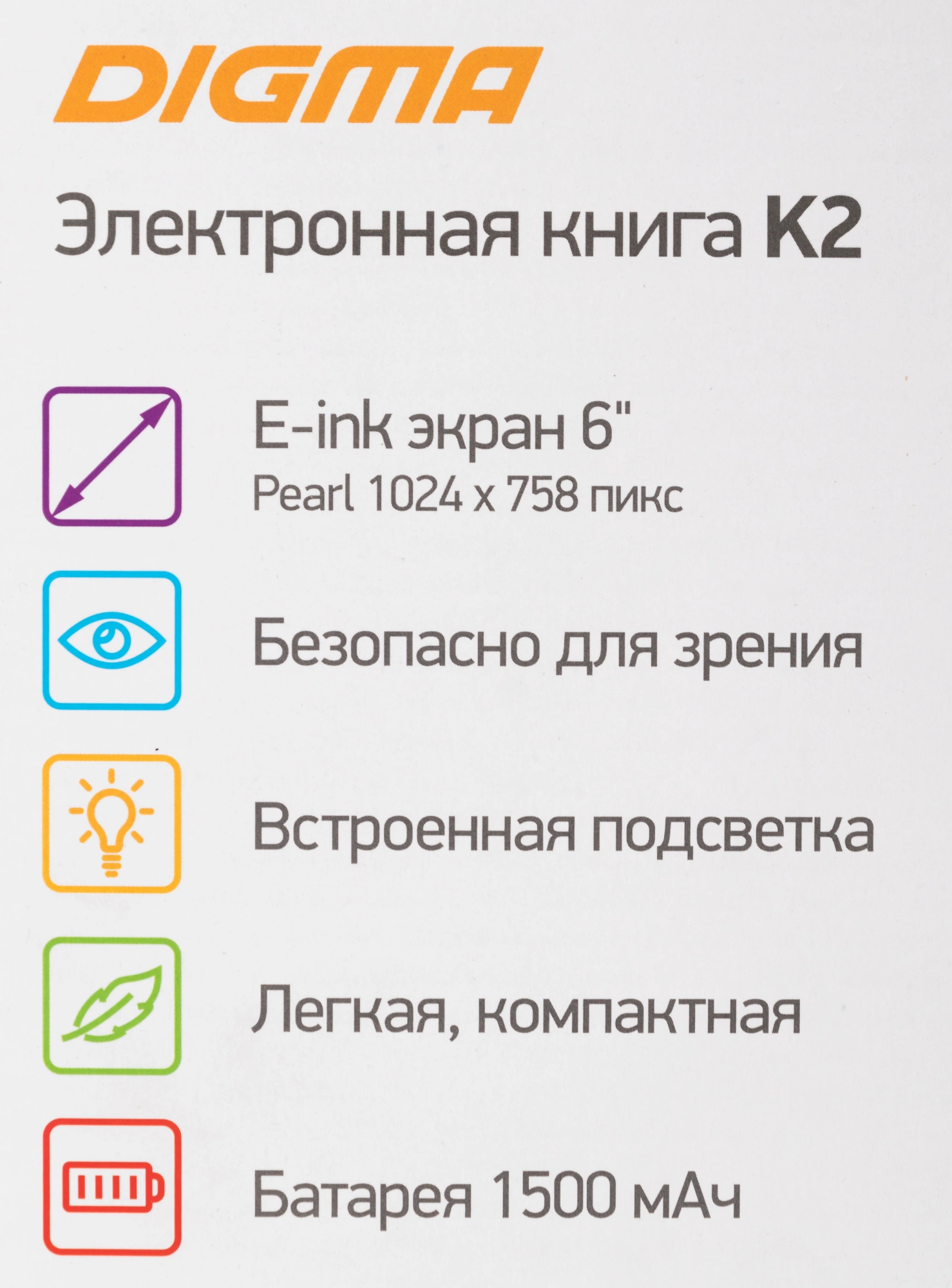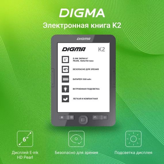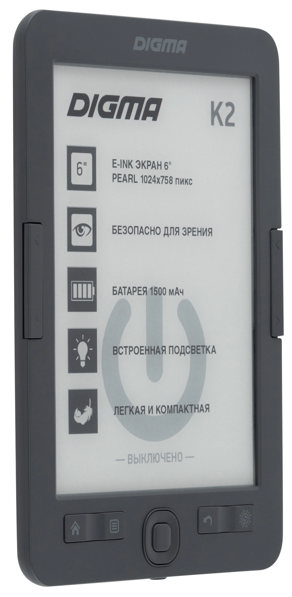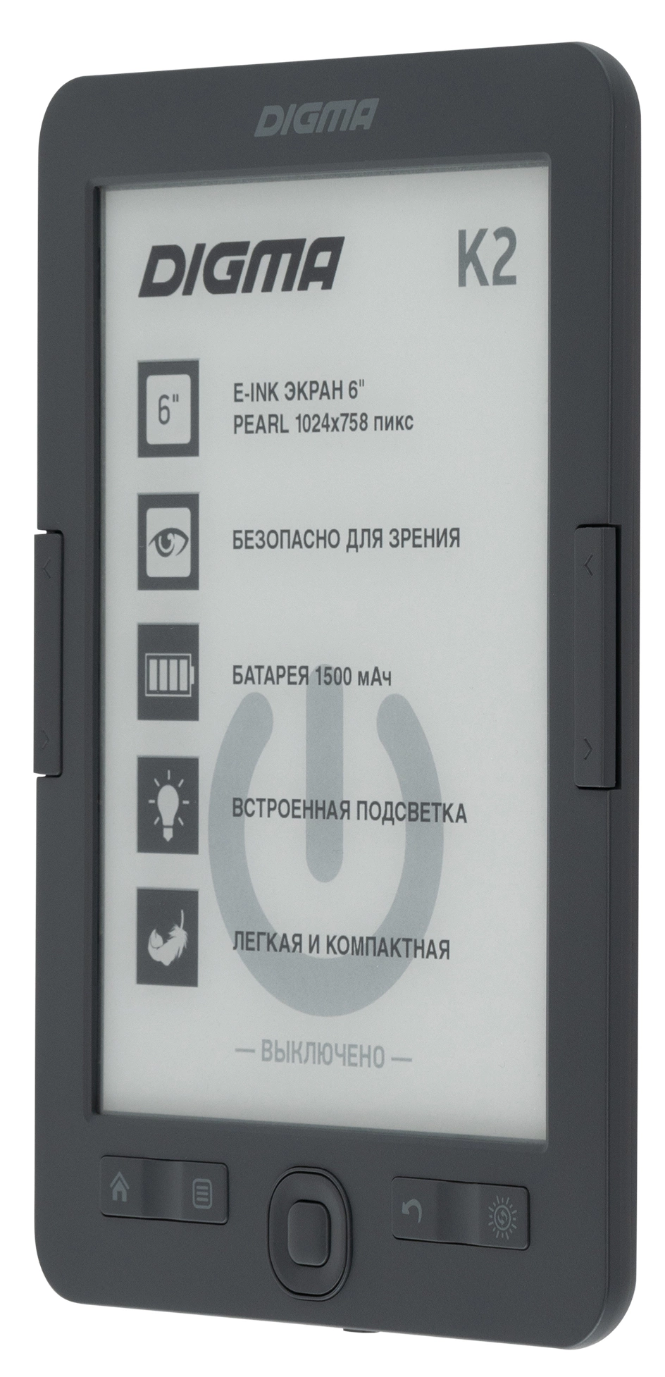 Электронная книга Digma K2G 6" E-ink HD Pearl 758x1024 600MHz/4Gb/microSDHC/подсветка дисплея темно-серый