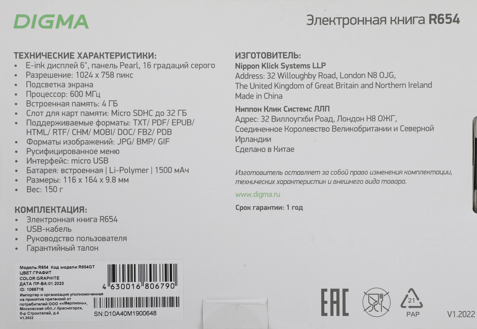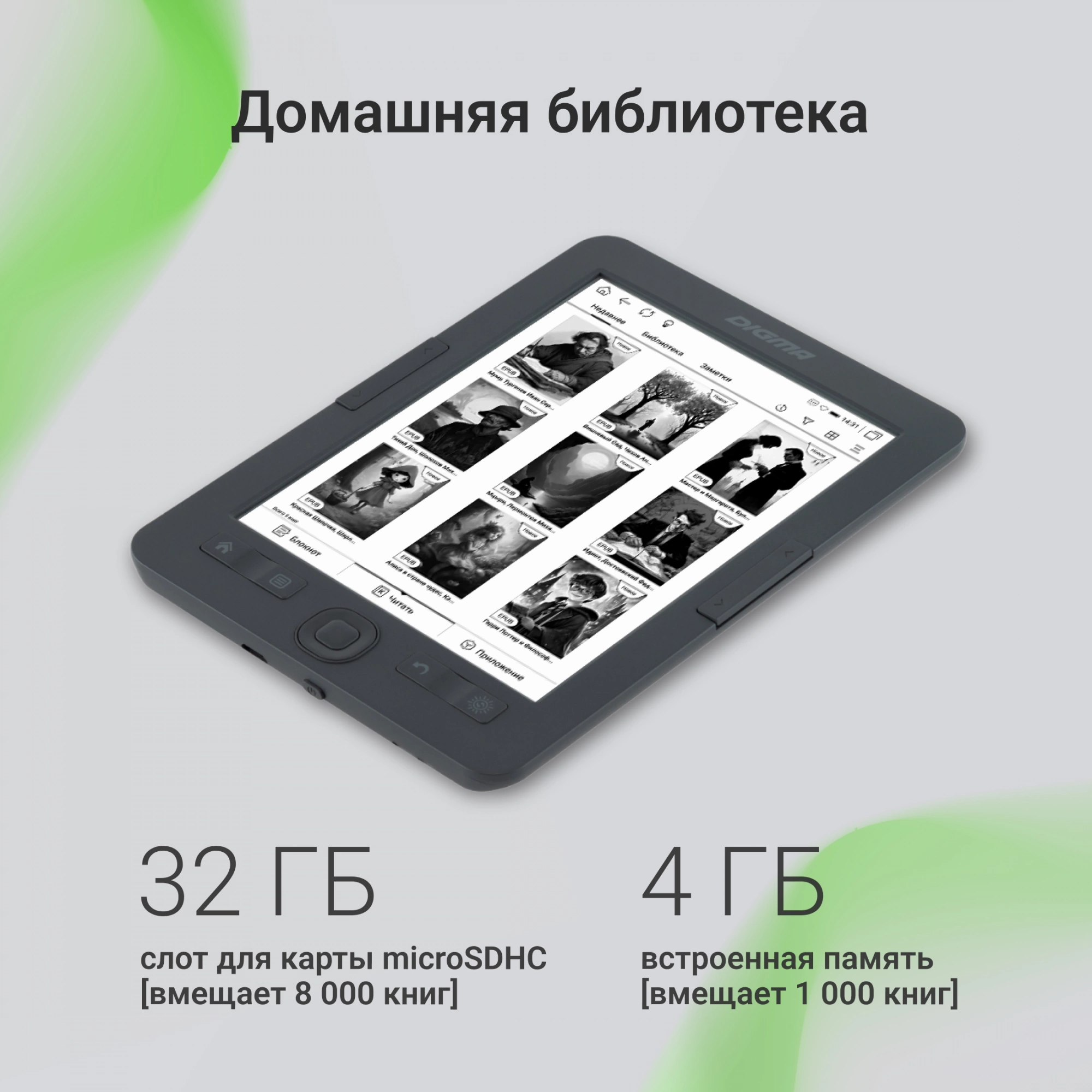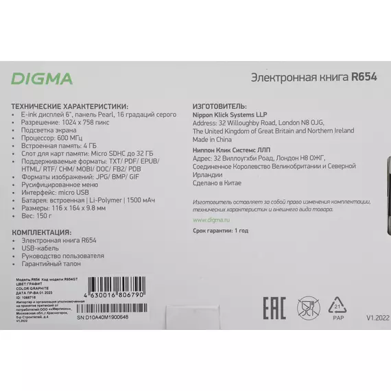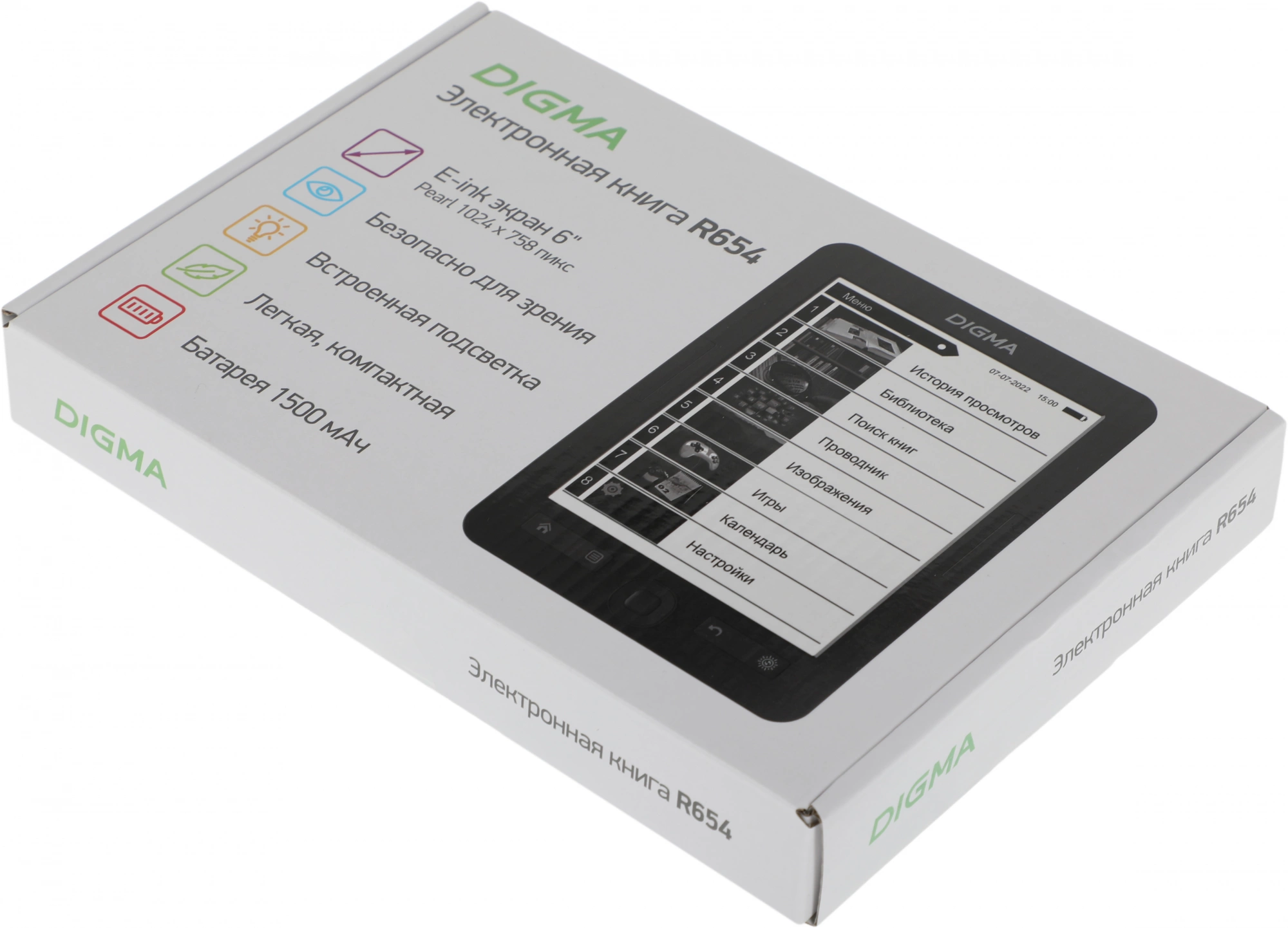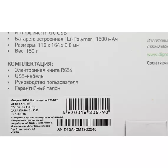 Электронная книга Digma R654 6" E-ink HD Pearl 1024x758 600MHz/4Gb/microSDHC/подсветка дисплея графит [R654GT]