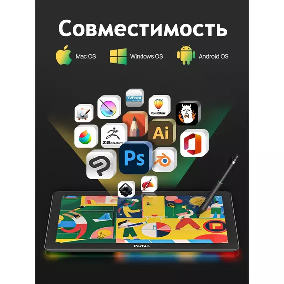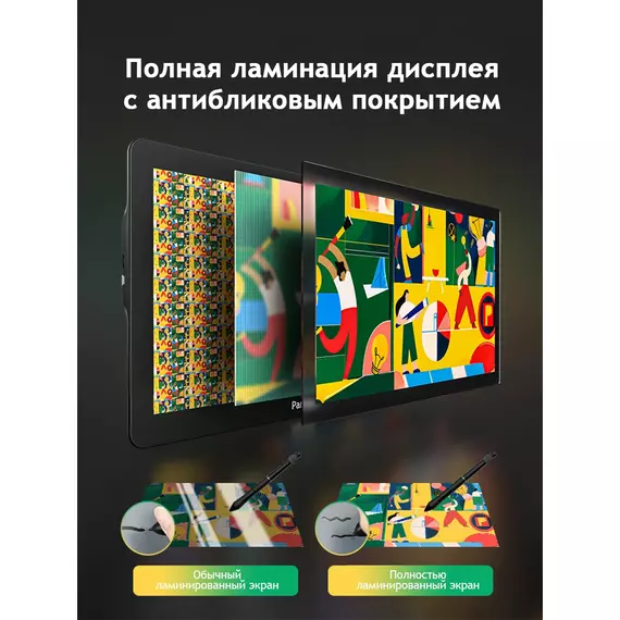 Разрешение дисплея 1980 х 1080 и полная ламинация обеспечивают чёткость изображения и комфортную работу. Устройство отображает до 16,7 млн цветов, что делает его незаменимым для графического дизайна, обработки фотографий, ретуши и даже 3D-моделирования. Совместим с Windows, Mac OS и Android