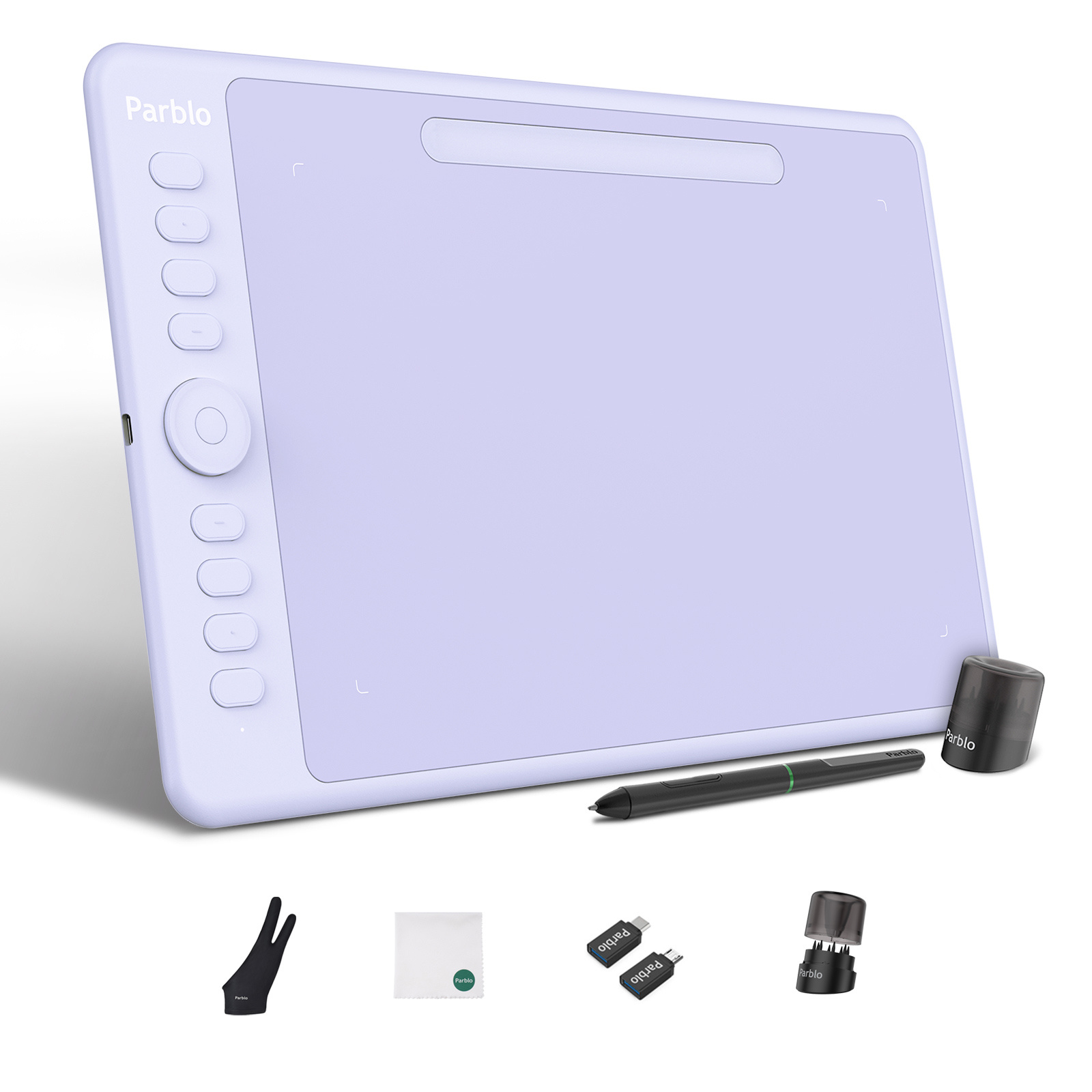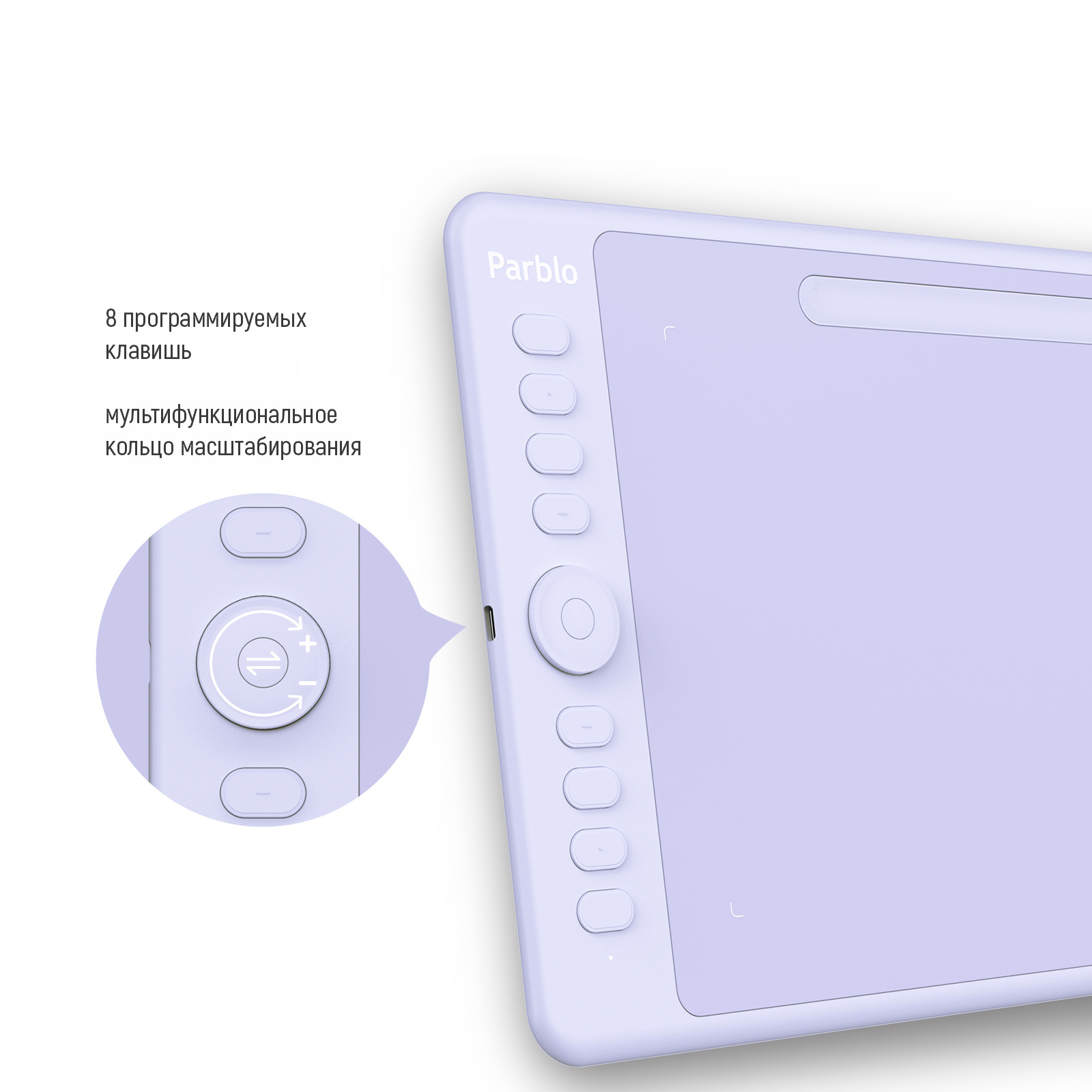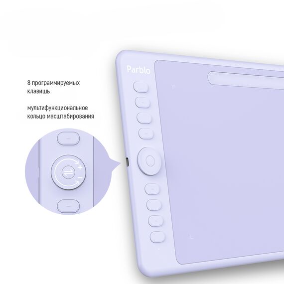 | Особенности | Parblo Intanbgo имеет программируемое Dial кольцо.Parblo Intangbo совместим со многими популярными графическими редакторами: Photoshop, SAI, Painter, Illustrator, Clip Studio, Crita и другими.В комплекте 2 OTG-переходника на USB Type-C и Micro. |