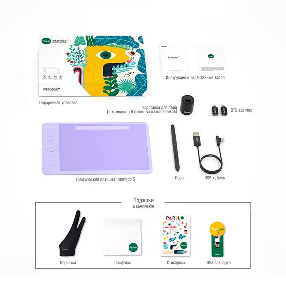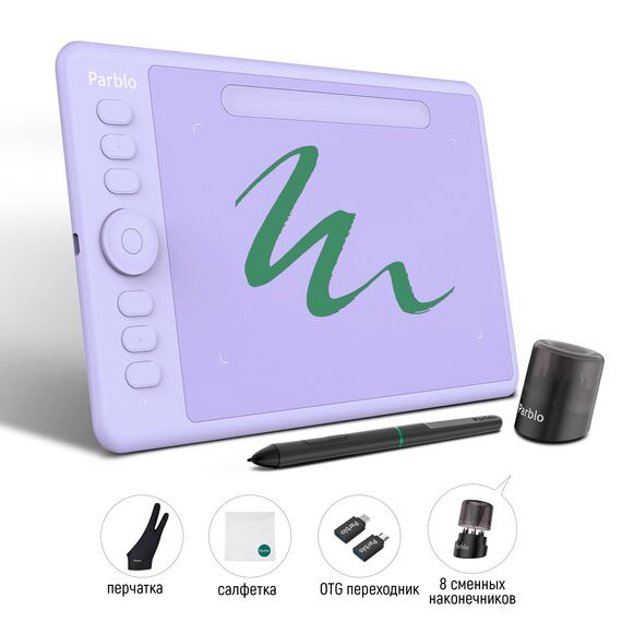 | Особенности | Parblo Intanbgo имеет программируемое Dial кольцо.Parblo Intangbo совместим со многими популярными графическими редакторами: Photoshop, SAI, Painter, Illustrator, Clip Studio, Crita и другими.В комплекте 2 OTG-переходника на USB Type-C и Micro. |