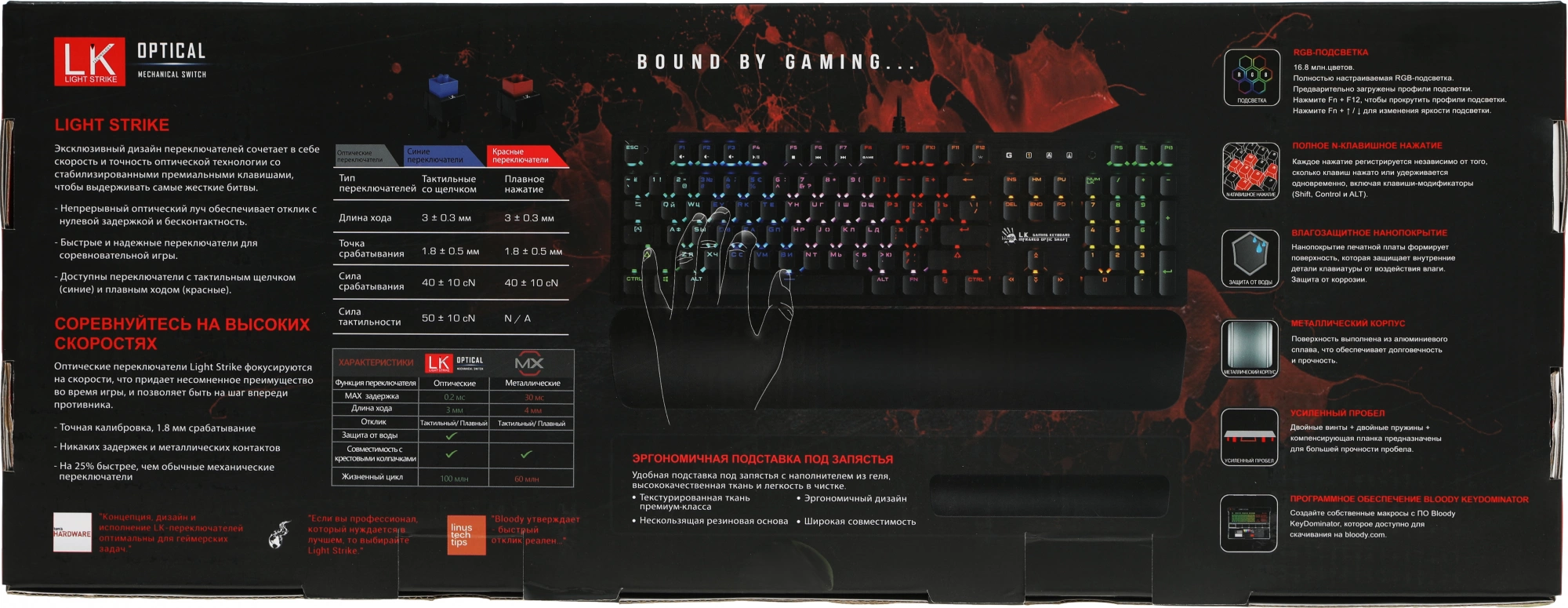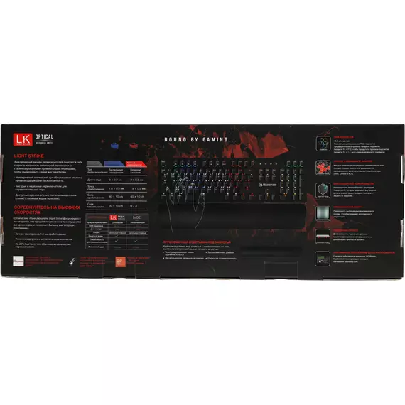 | Особенности | 6 эффектов подсветки, Алюминиевая панель, 100% N-клавишное нажатие, инновационная подставка под запястия |