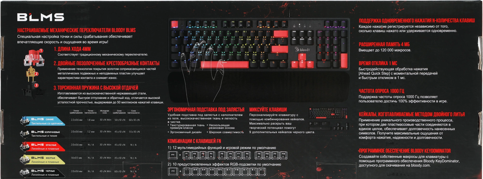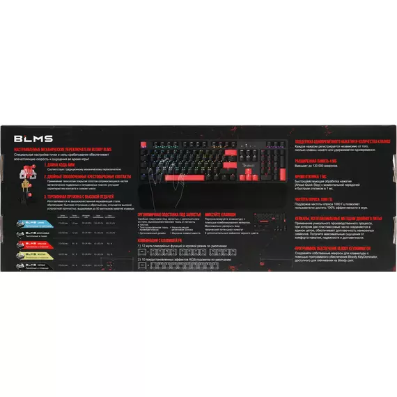 | Особенности | Механические свитчи BLMS, двойное литье кейкапов, 4М памяти, 10 предуст эффектов подсветки, 100% N-нажаите |