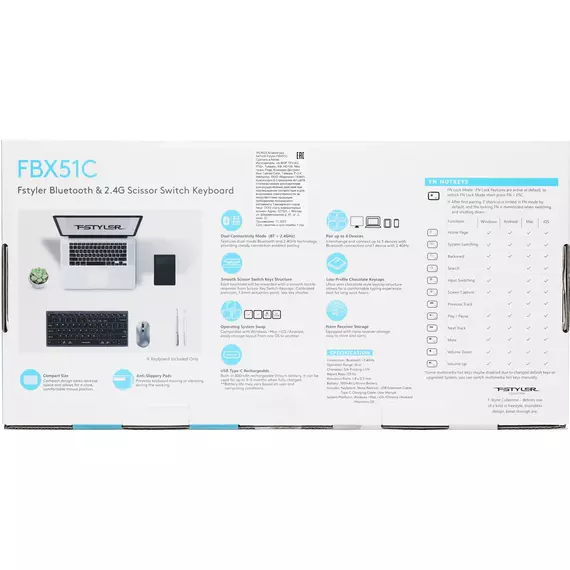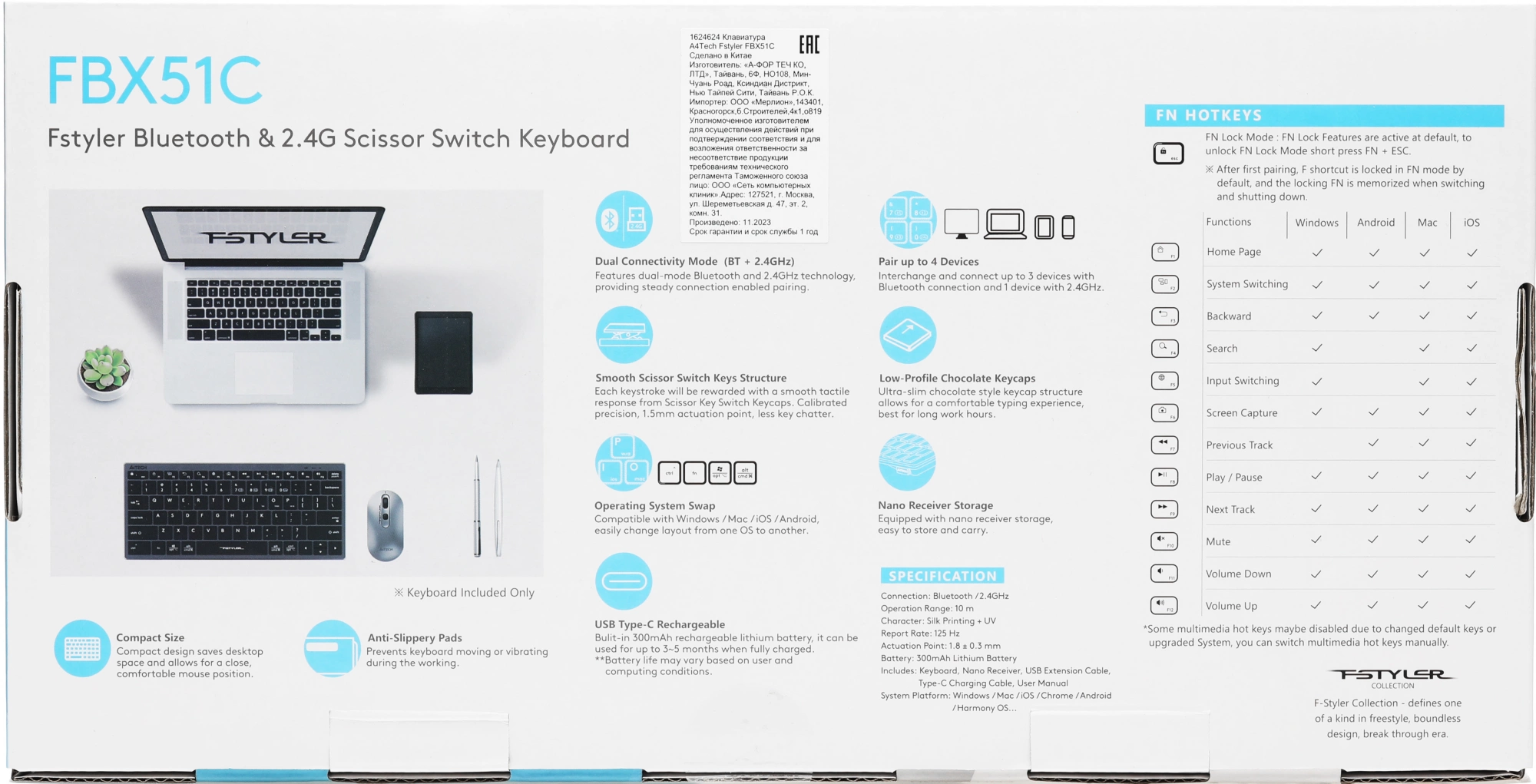 | Особенности | Возможность подключения по BT и радио. Работает с PC и Mac. Горячие мультимедийные клавиши: 12 Fn. Ножничный механизм клавиш. Встроенная перезаряжаемая литиевая батарея емкостью 300 мАч позволяет использовать ее до 8 месяцев при полной зарядке. |