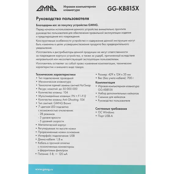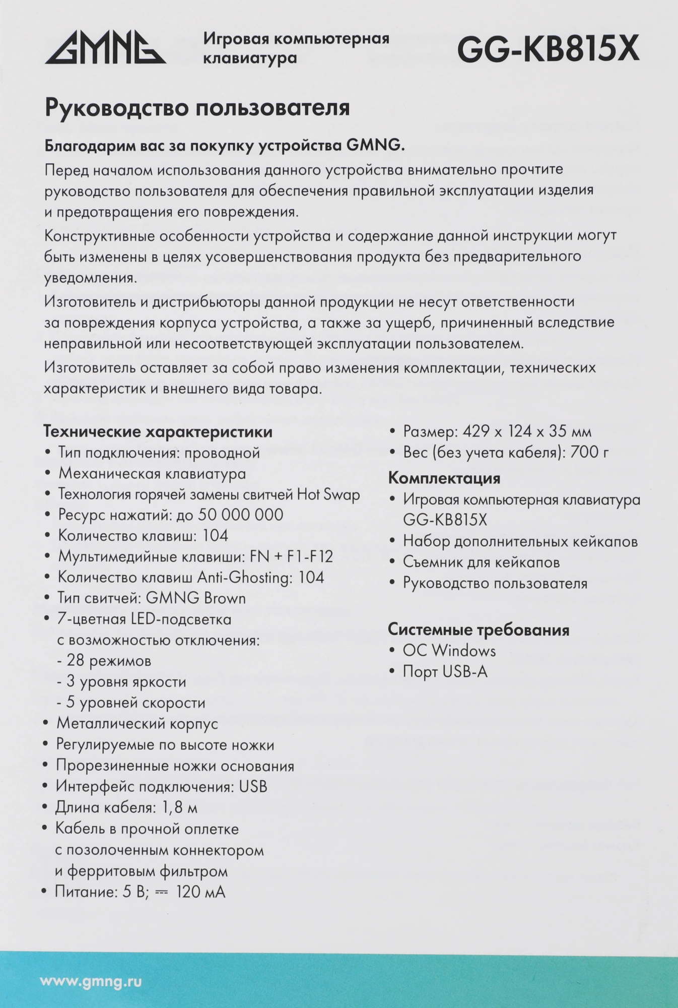 Клавиатура GMNG GG-KB815X механическая черный/белый USB Multimedia for gamer LED [1913914]