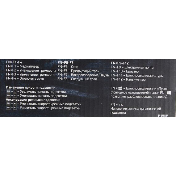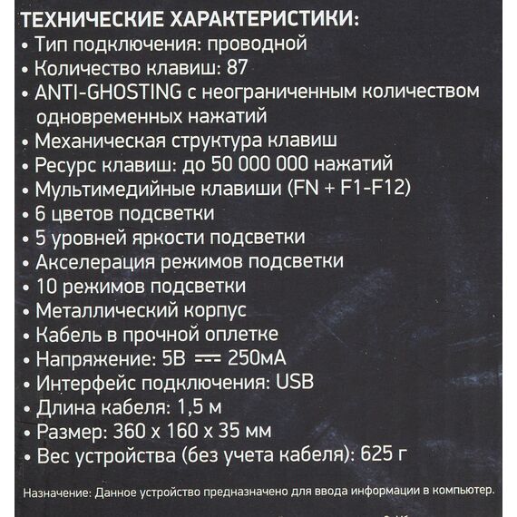 | Особенности | 6 цветов подсветки, 10 режимов, металлический корпус. ANTI-GHOSTING с неограниченным количеством одновременных, Ресурс клавиш до 50 000 000 нажатий, Мультимедийные клавиши (FN-F1-F12) |