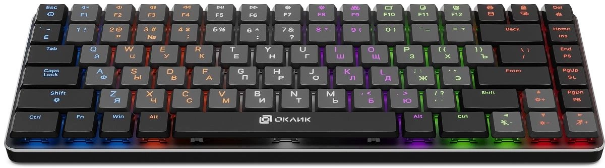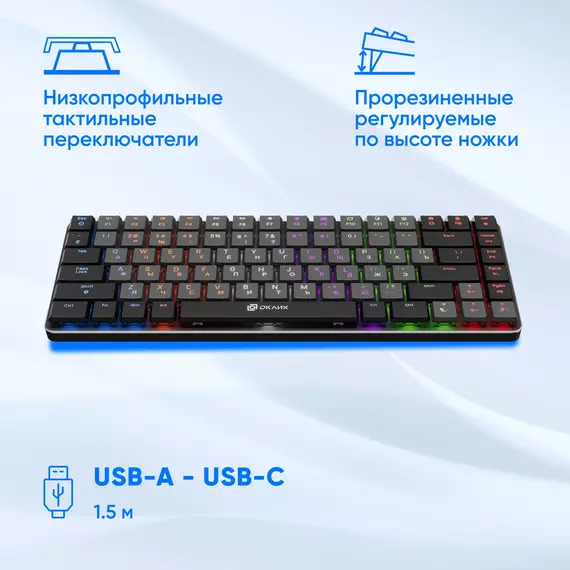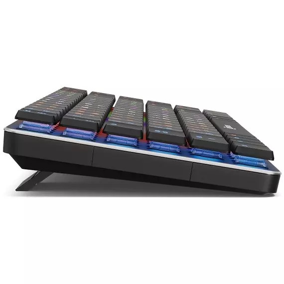 | Особенности | Ресурс нажатий: до 50 000 000, короткие линейные свитчи, многоцветная LED-подсветка, выдвижные ножки, прочный алюминиевый корпус. |