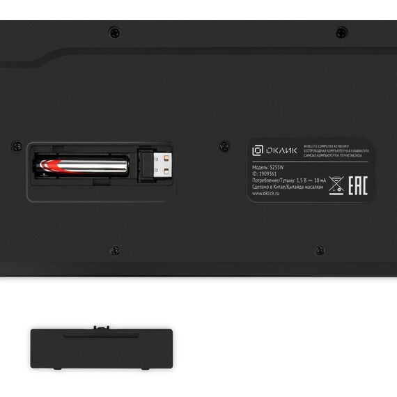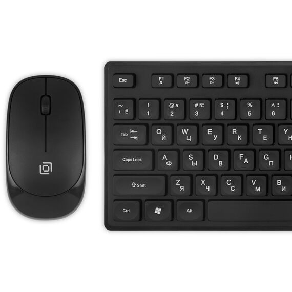 Дизайн набора Oklick S255W выполнен в классическом стиле: черный корпус с белыми буквами русского и английского языка на клавишах. Это делает устройства элегантными и стильными, подходящими к офисному интерьеру или рабочему пространству дома.