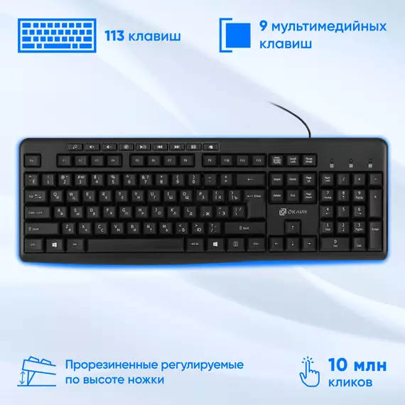 | Особенности клавиатуры | Эргономичная клавиатура с продуманной конструкцией для работы дома и в офисе. Девайс оборудован регулируемыми по высоте ножками. Дополнительные мультимедийные и офисные клавиши обеспячат быстрый доступ и управление нужными приложениями. |