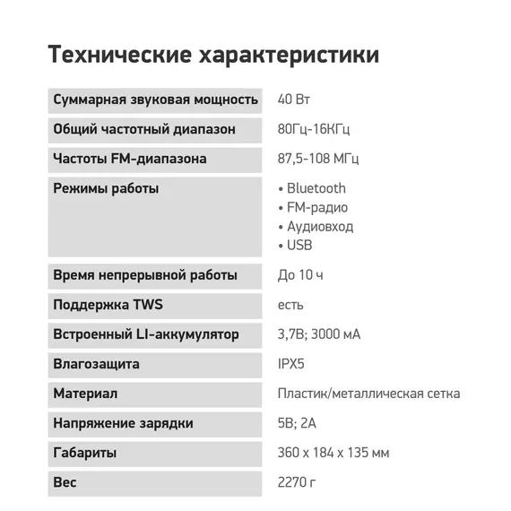| Суммарная звуковая мощность | 40 Вт |