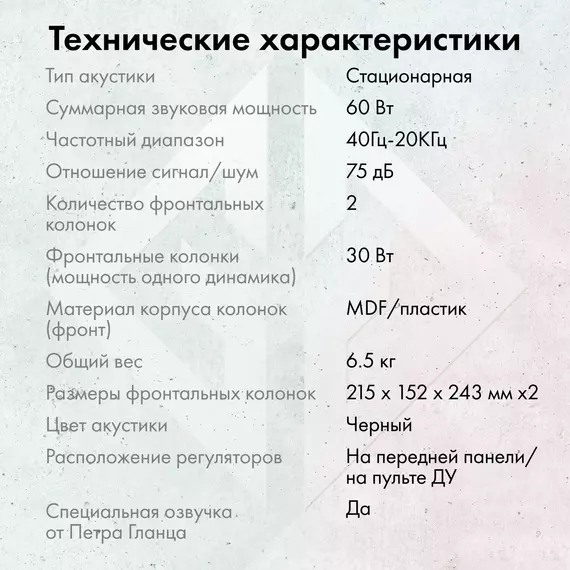| Материал корпуса колонок (фронт) | MDF/пластик |