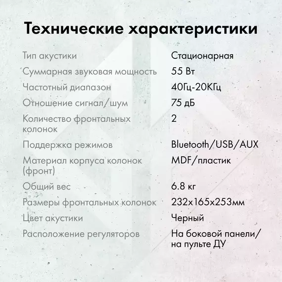 | Материал корпуса колонок (фронт) | MDF/пластик |