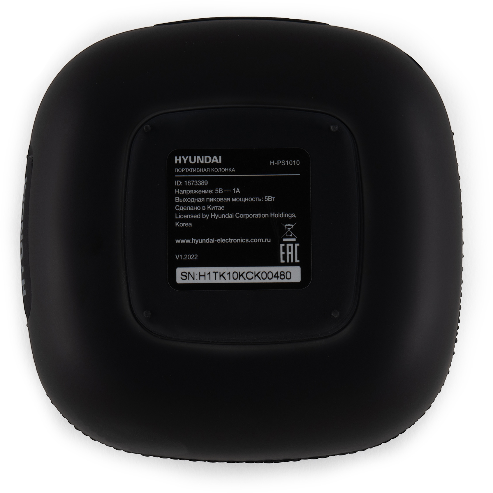 Кнопки, управляющие воспроизведением и его опциями, находятся на верхней панели прибора – их всего три, поэтому всё весьма интуитивно. Дизайн Hyundai H-PS1010 выполнен в минималистичном чёрном оформлении. Верхняя сетка защищает широкополосный динамик от физических повреждений.