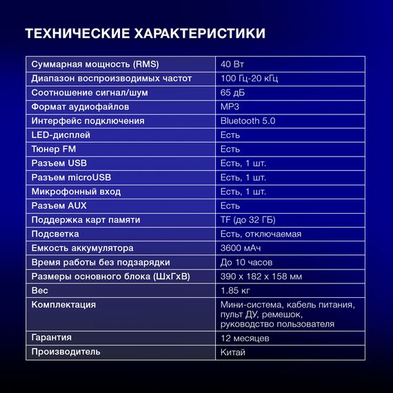 | Суммарная звуковая мощность | 40 Вт |