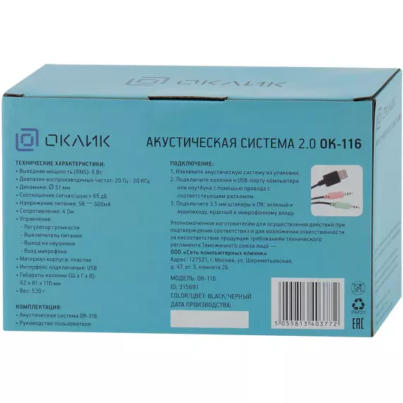 Колонки Oklick OK-116 2.0 черный 6Вт [315691]